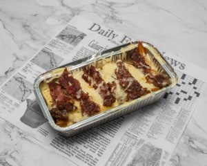 Huisgemaakte gekruide Kefta met frietjes, gesmolten kaas en verse salade uit de oven.